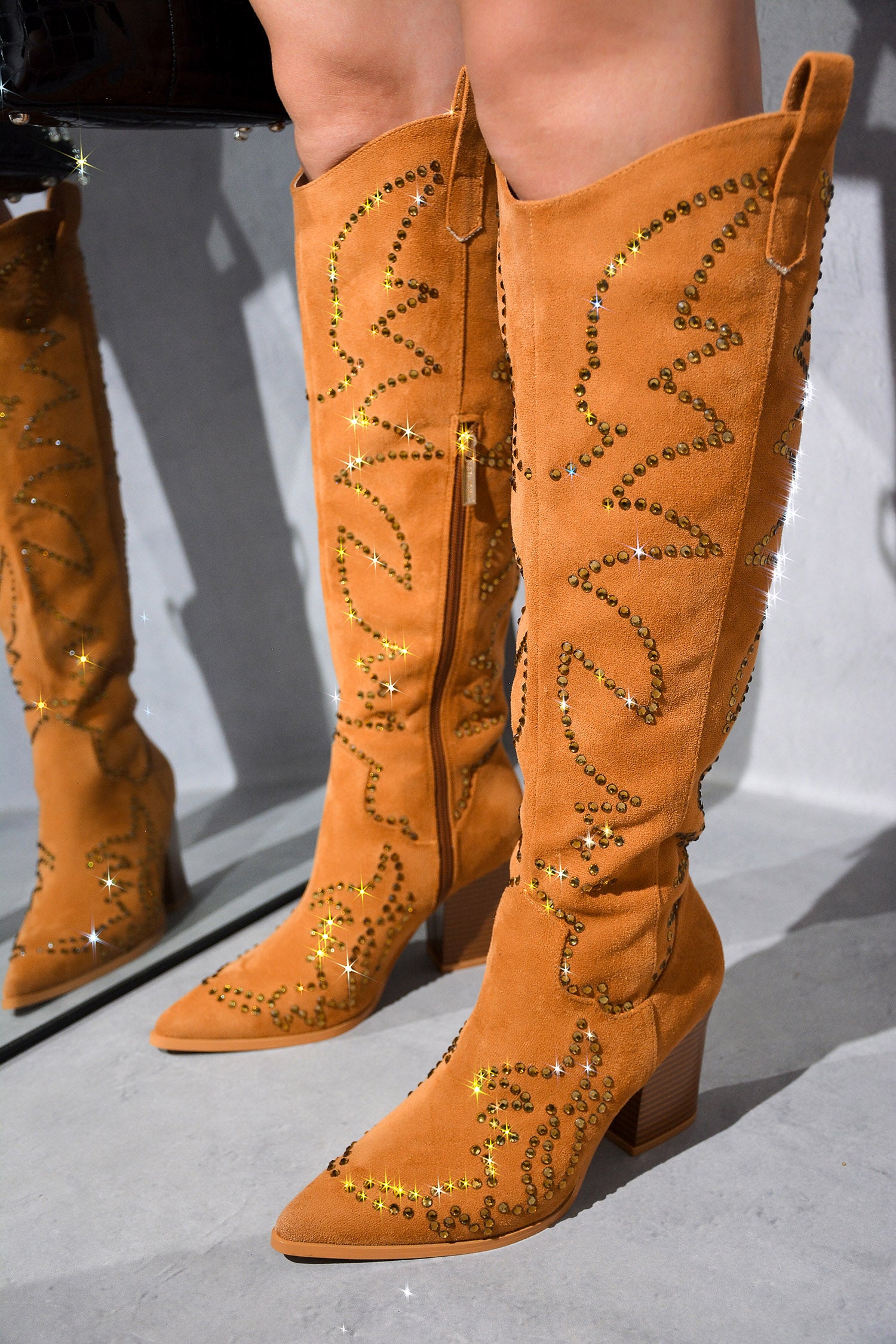 Nayaye Rhinestone Western Cutout Cowboy Stiletto Heels - Black
