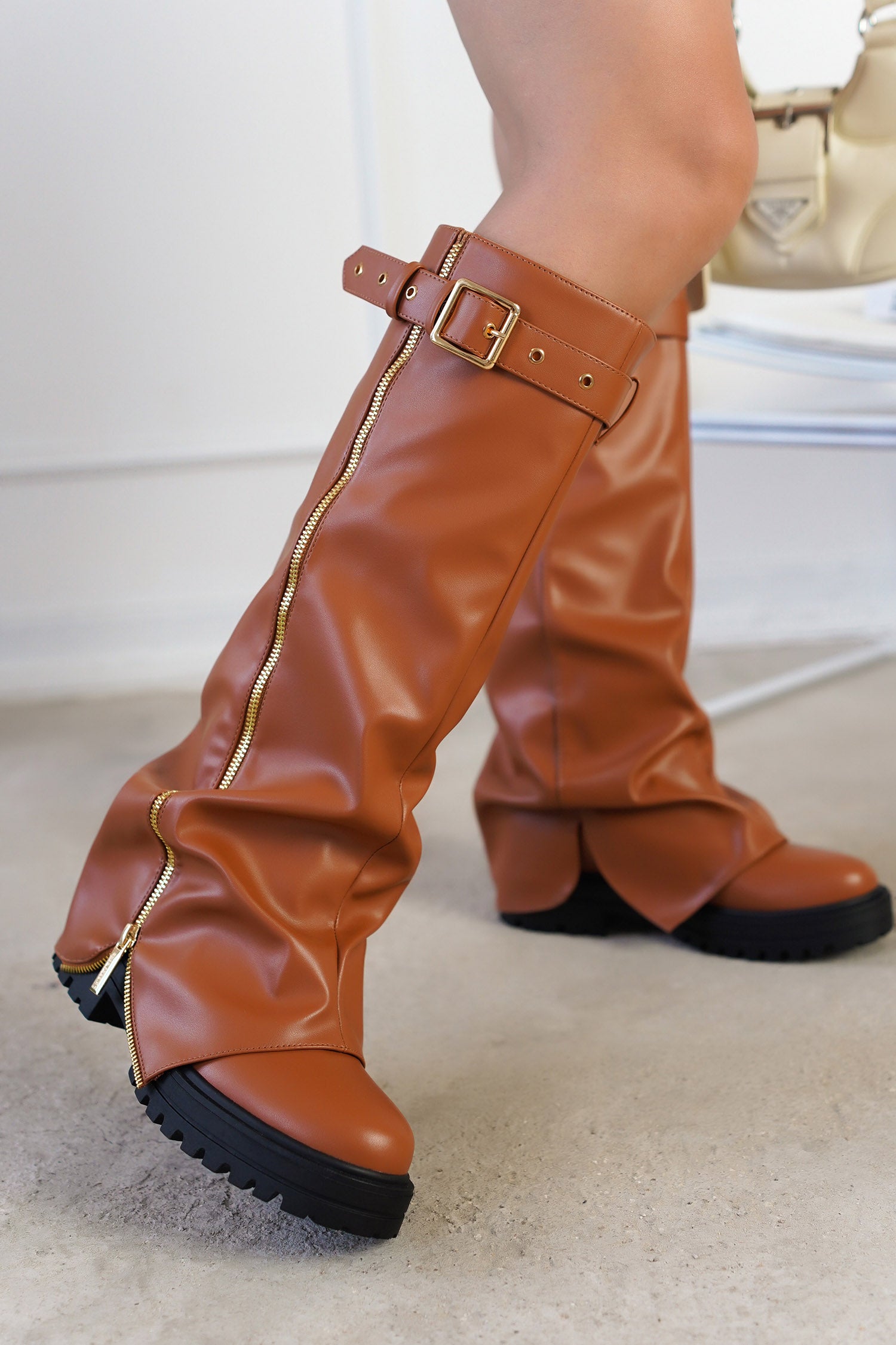 Funafuti Platform Fold-Over Knee High Boots - Tan