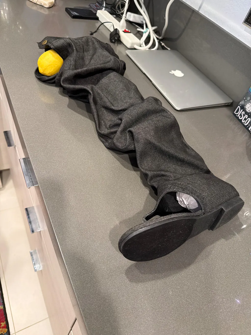 When I went to pull the boot over my knee, I realize the flaw in the design. They tried to be clever by mirroring a pair of jeans complete with a button that you would find on your jeans. Right below that area was an open name that normally would hold a zipper but in this case they did not use the zipper and as soon as you pulled the boot up over your knee, the open area completely falls open, exposing a very ugly unfinished product, which absolutely looks ridiculous.
