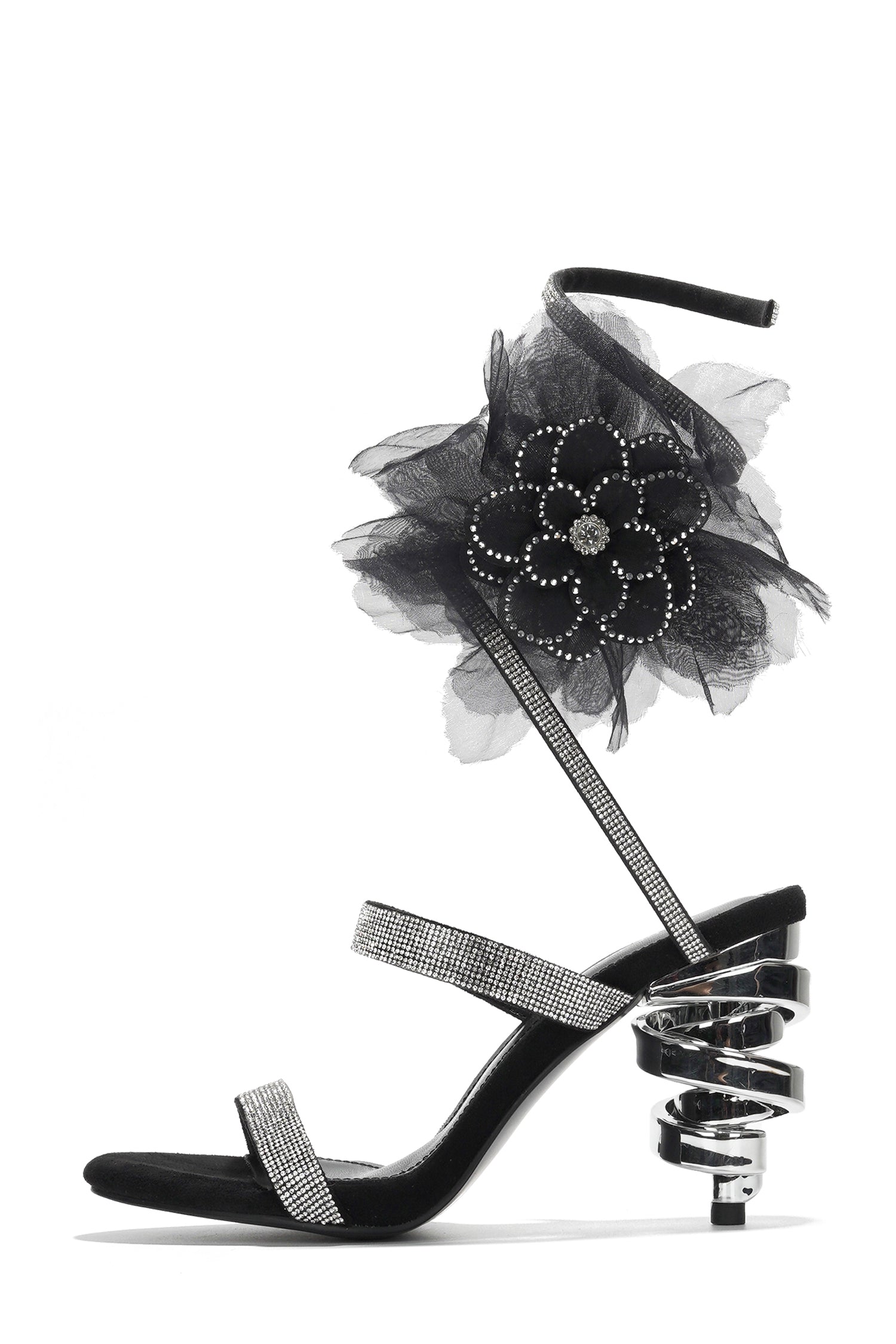 - Chrome finishThe Candra heels are designed to make you the center of attention at any event. These stunning sandals feature sparkling rhinestone-encrusted straps that elegantly wrap around your ankles, adding a touch of sophistication and glamour to your look. The unique spiral heel design is a true statement piece, providing a bold and stylish twist to classic stiletto heels. The delicate flower embellishment on the ankle strap adds an extra layer of elegance and charm, perfect for special occasions or a night out on the town. Perfect for pairing with your favorite dresses or sleek evening outfits,
