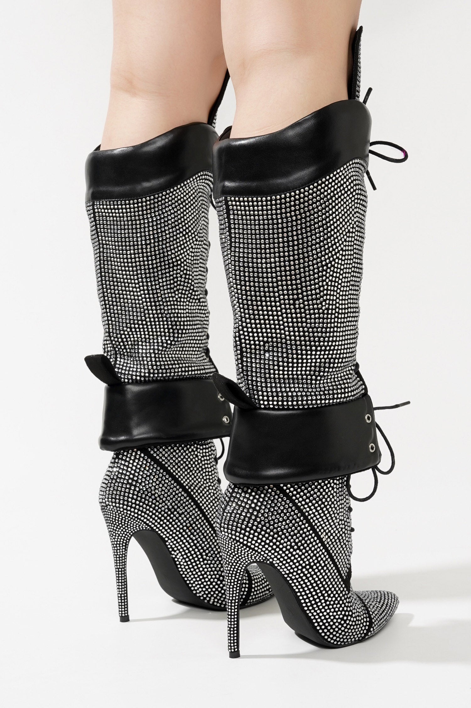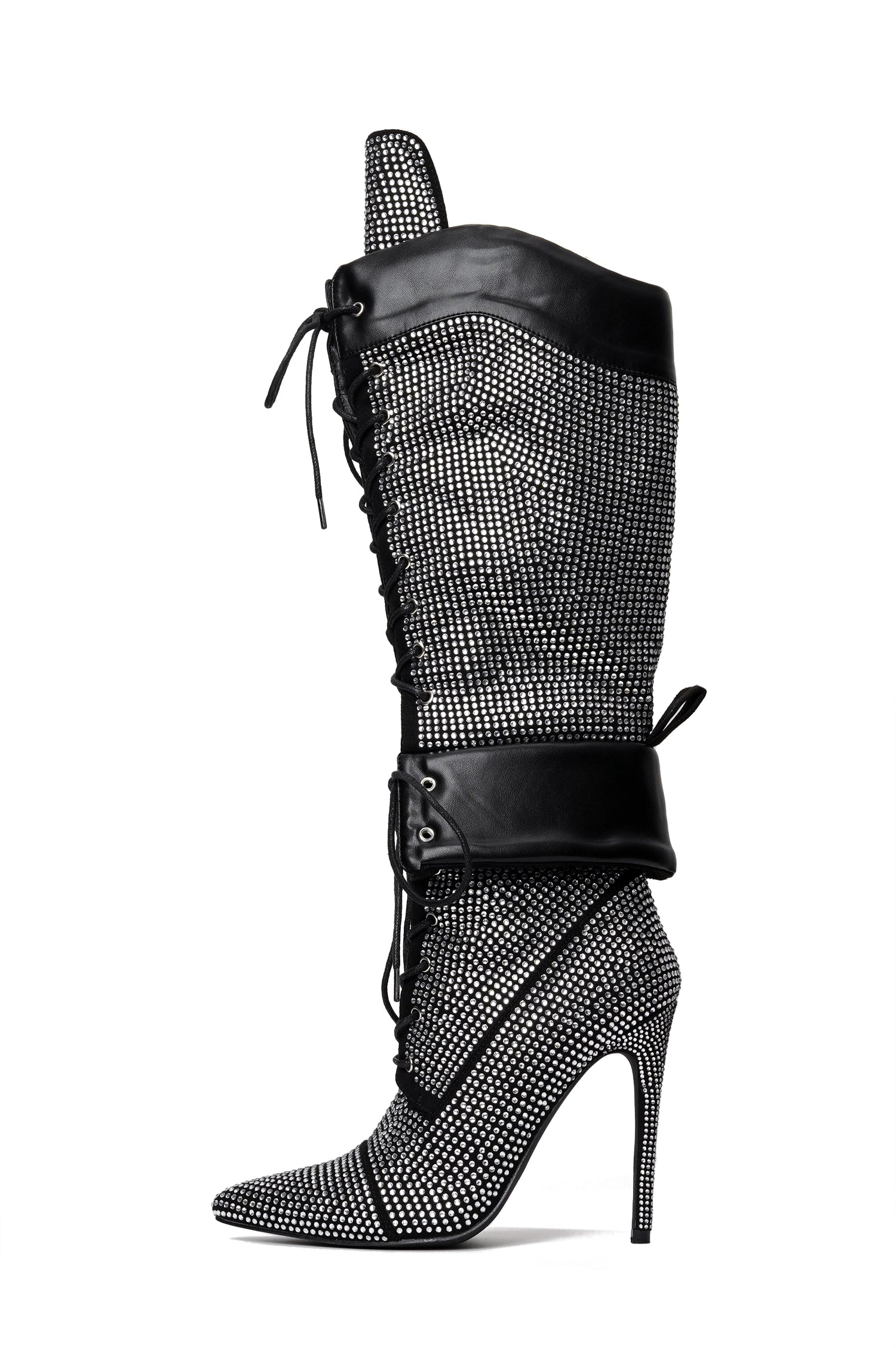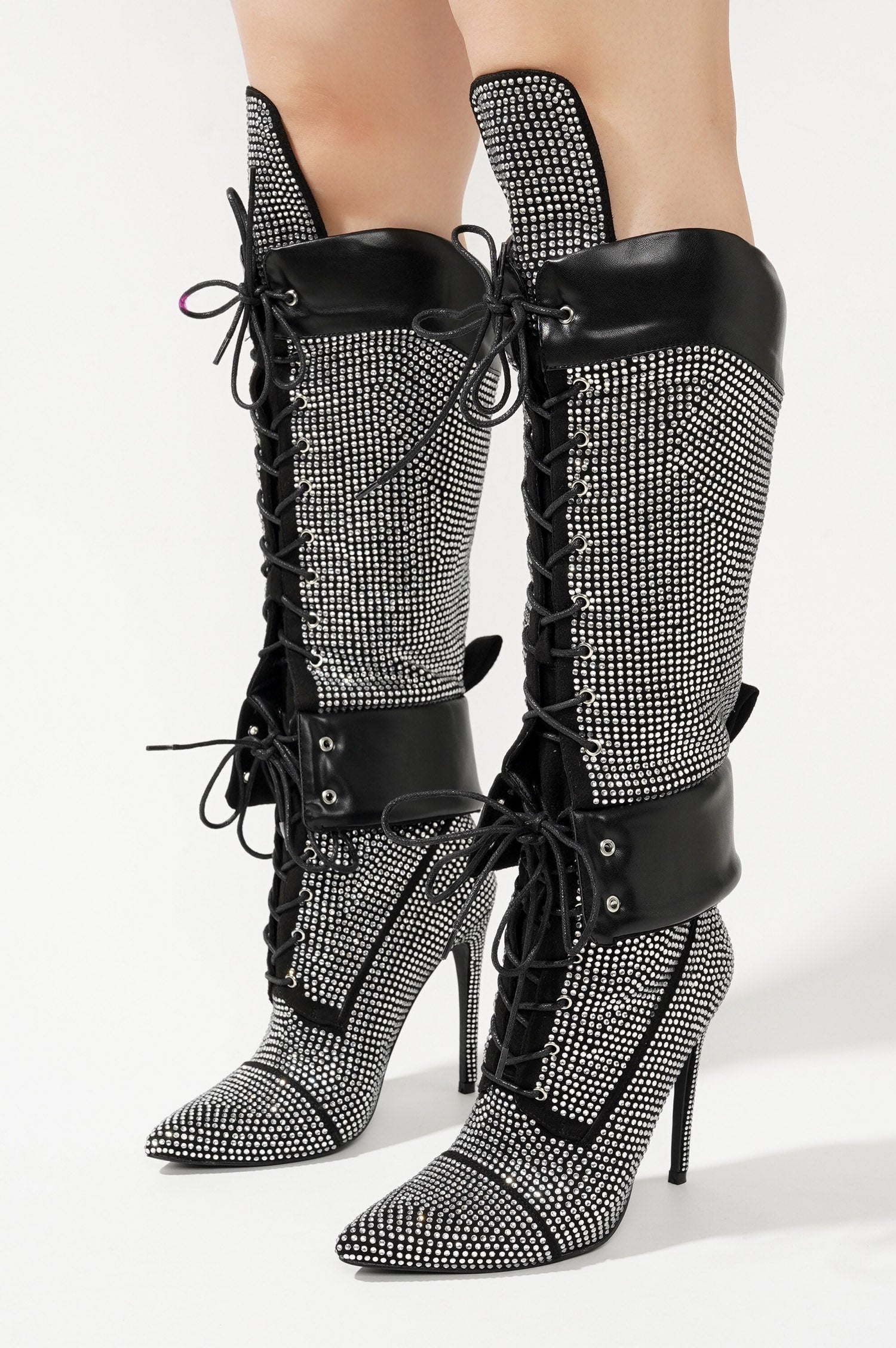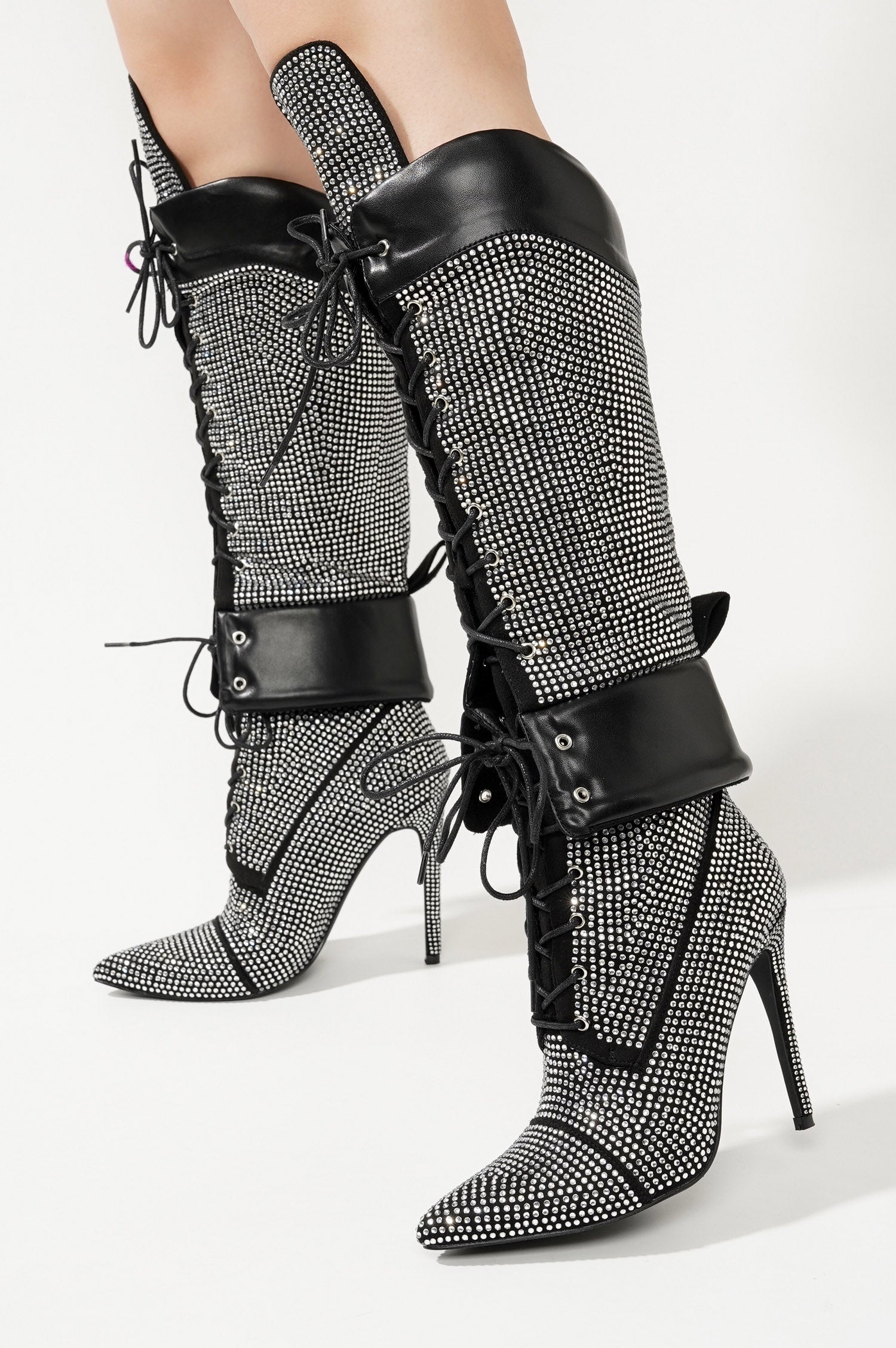 Charlott Rhinestone Embellished Lace Up Stiletto Knee High Boots - Black