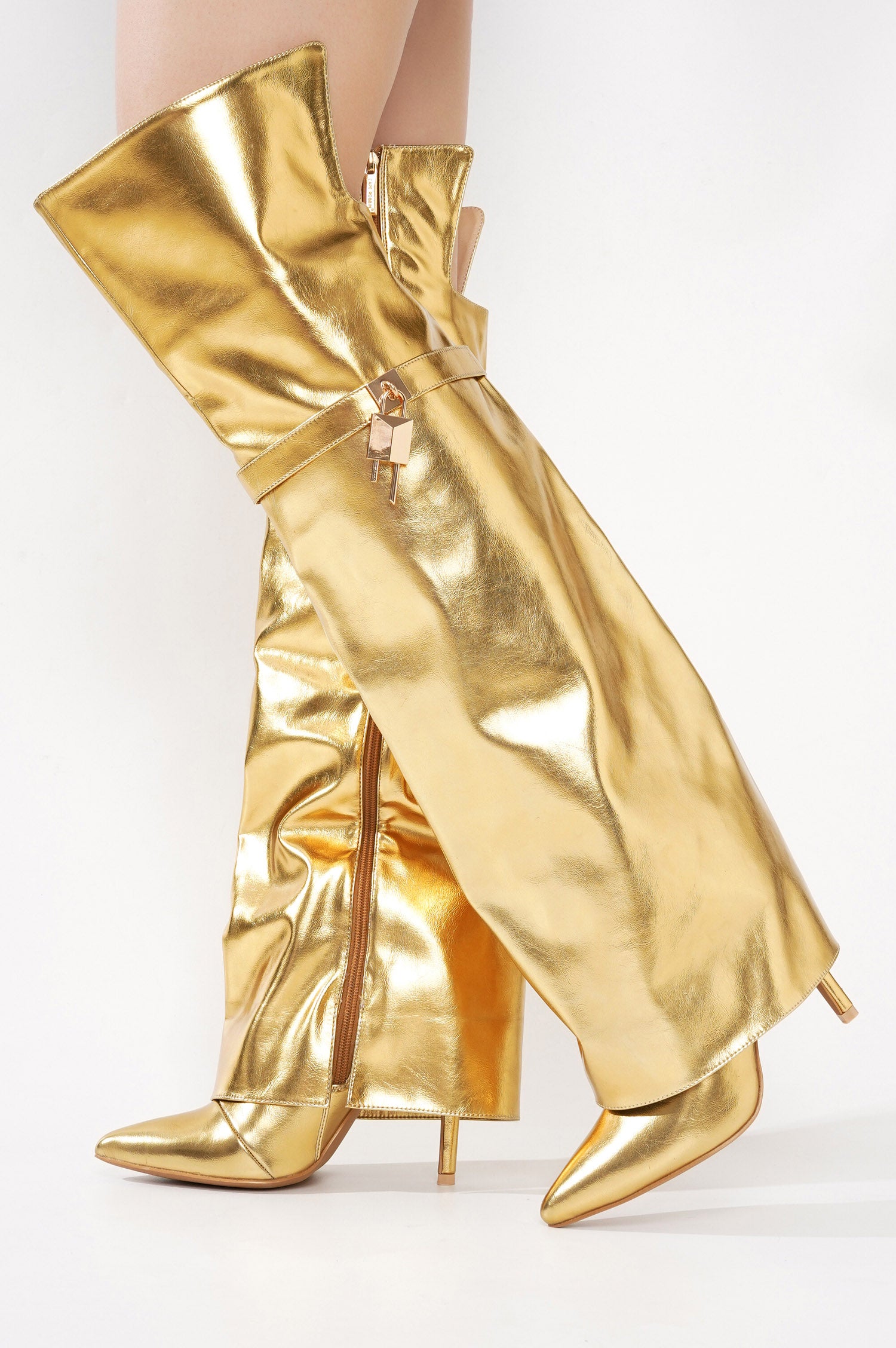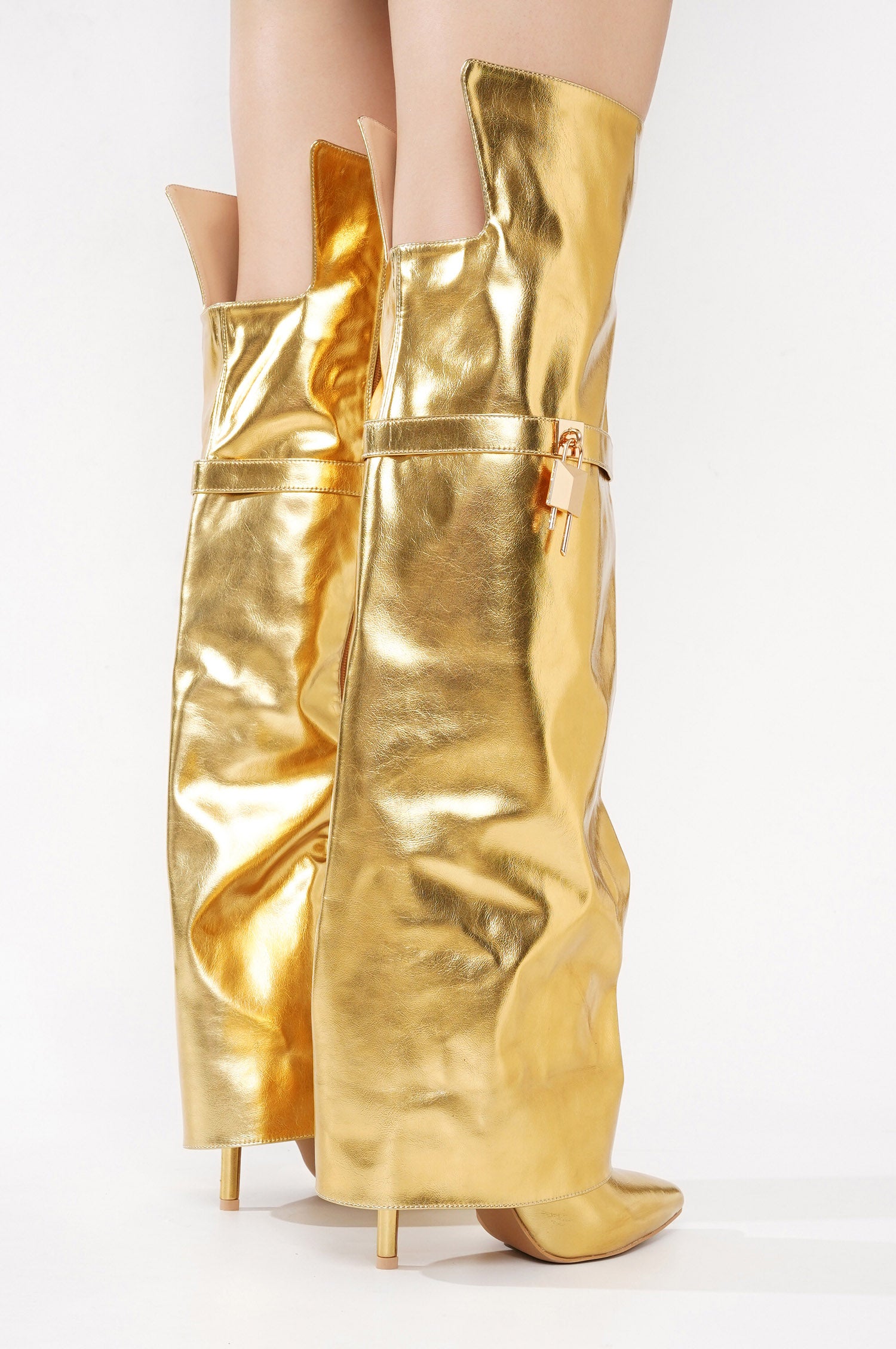 Dollie Fold-over Glossy Patent Leather Thigh High Boots - Gold