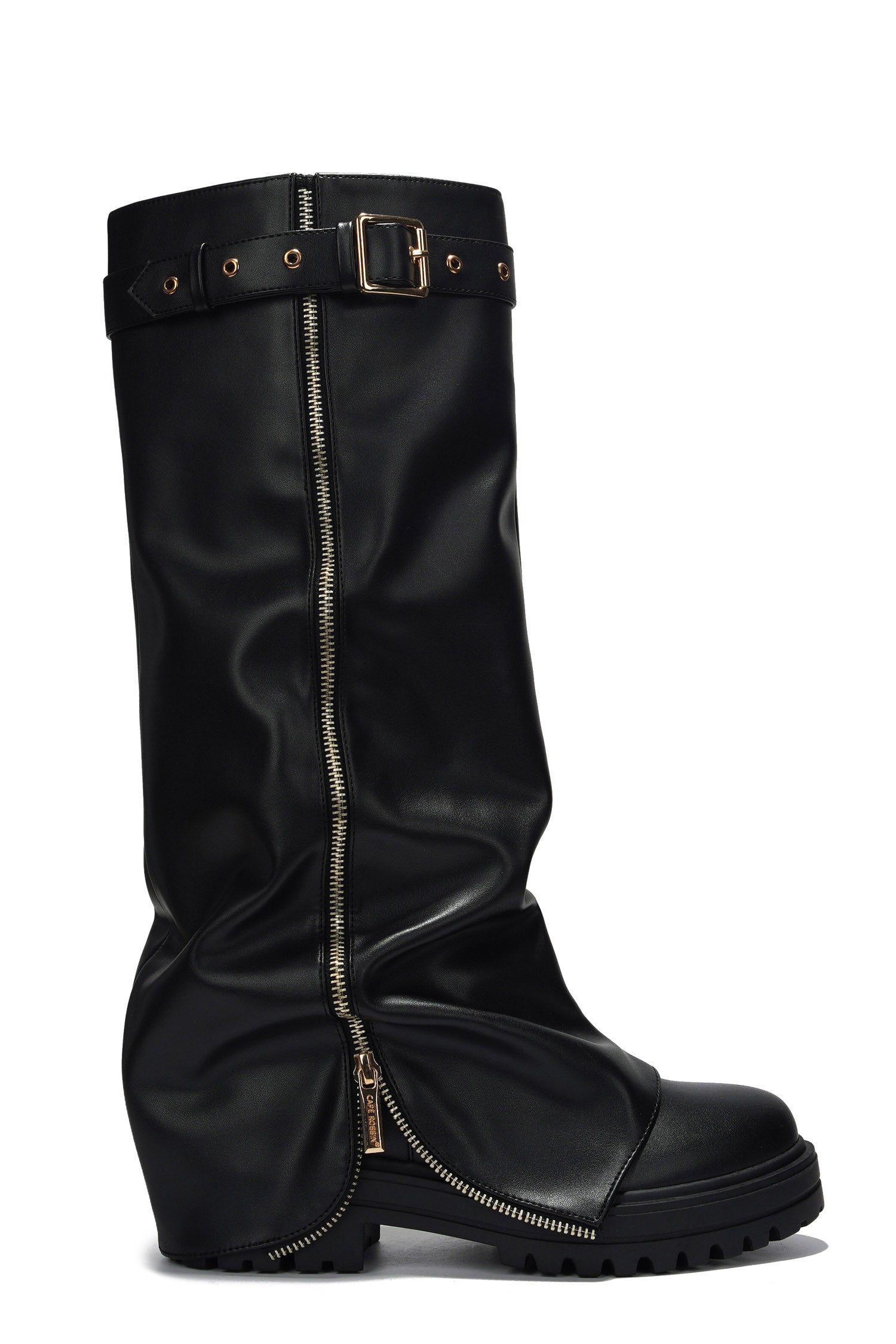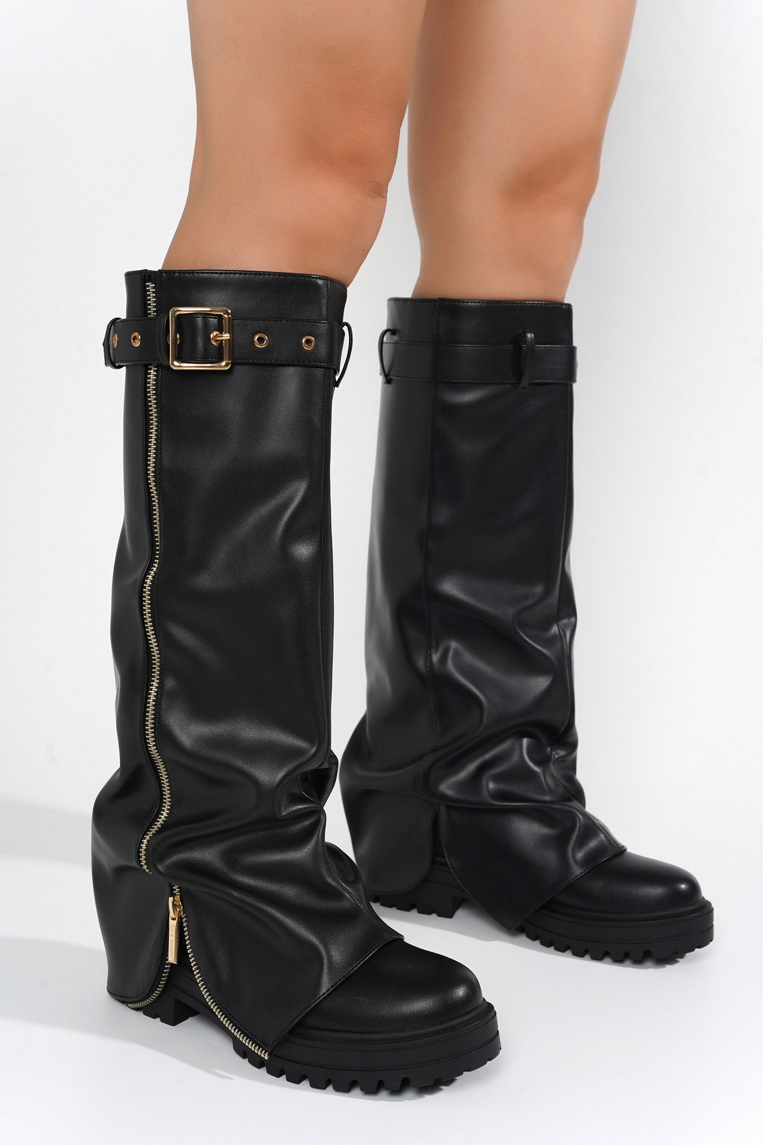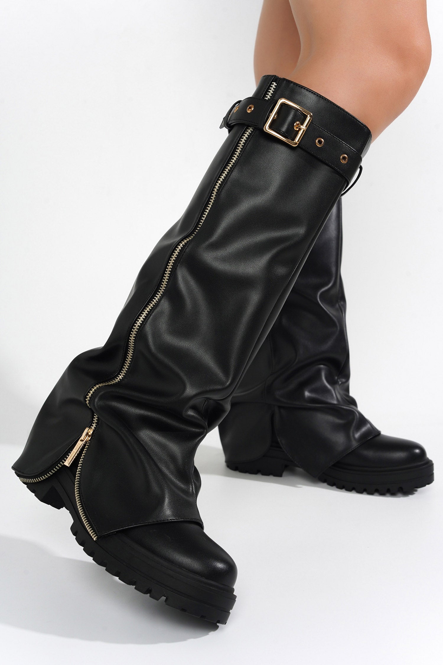 Funafuti Platform Fold-Over Knee High Boots - Black