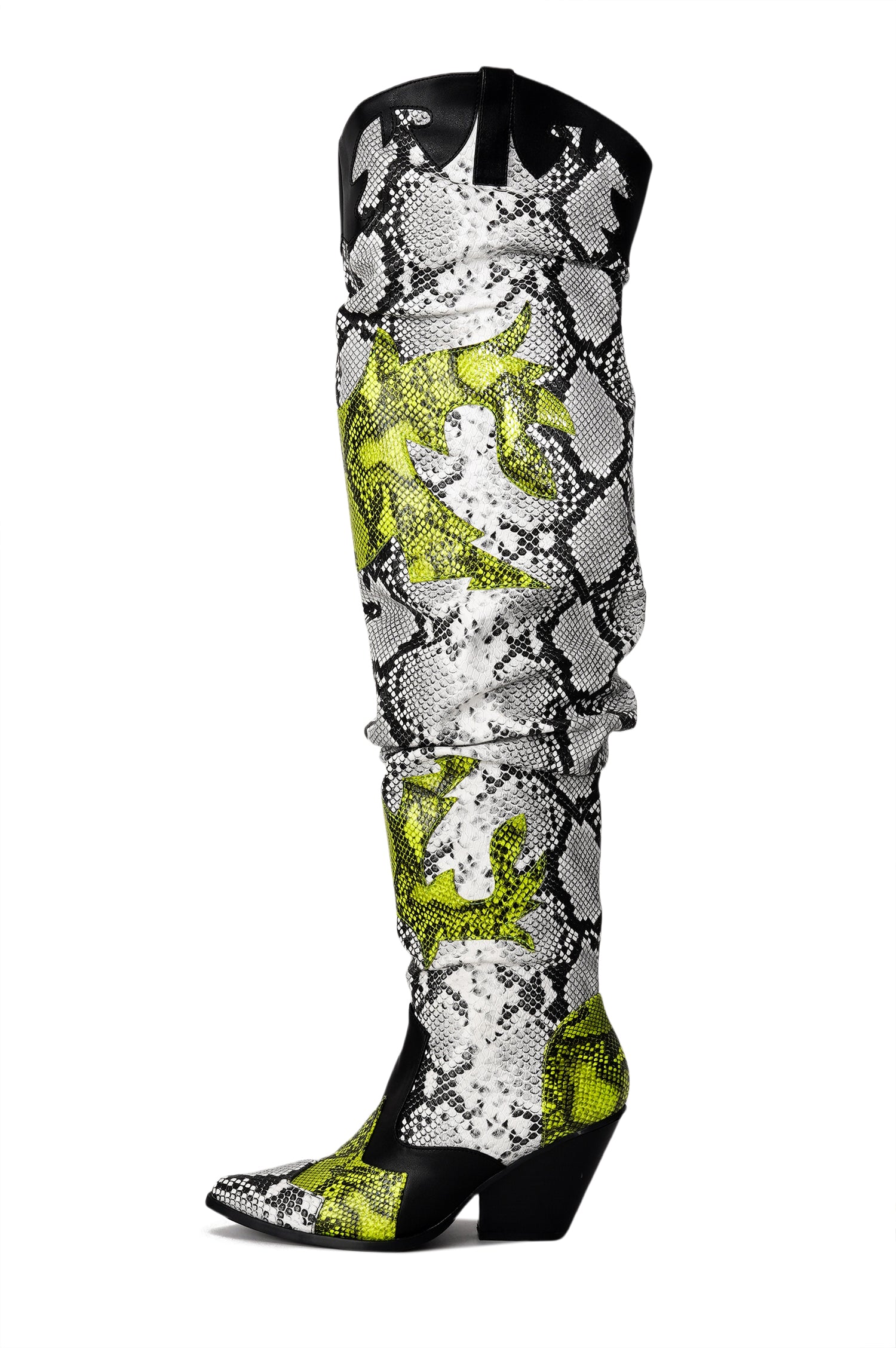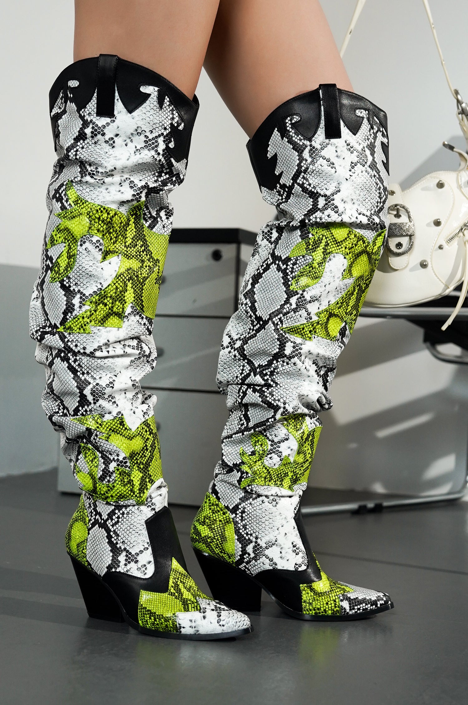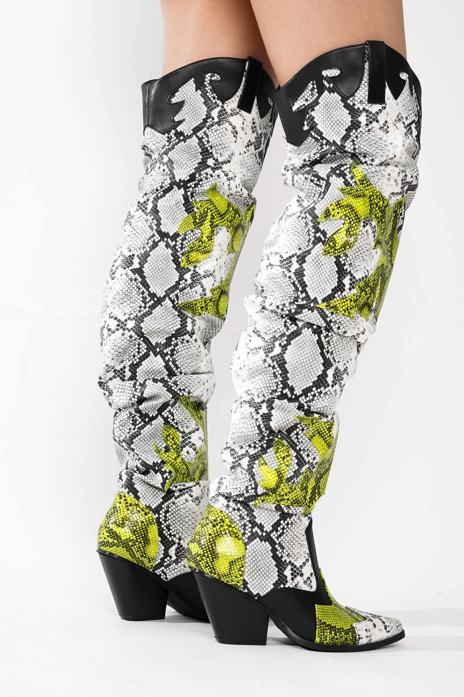 Hilda Faux Snakeskin Thigh High Cowboy Boots - Black