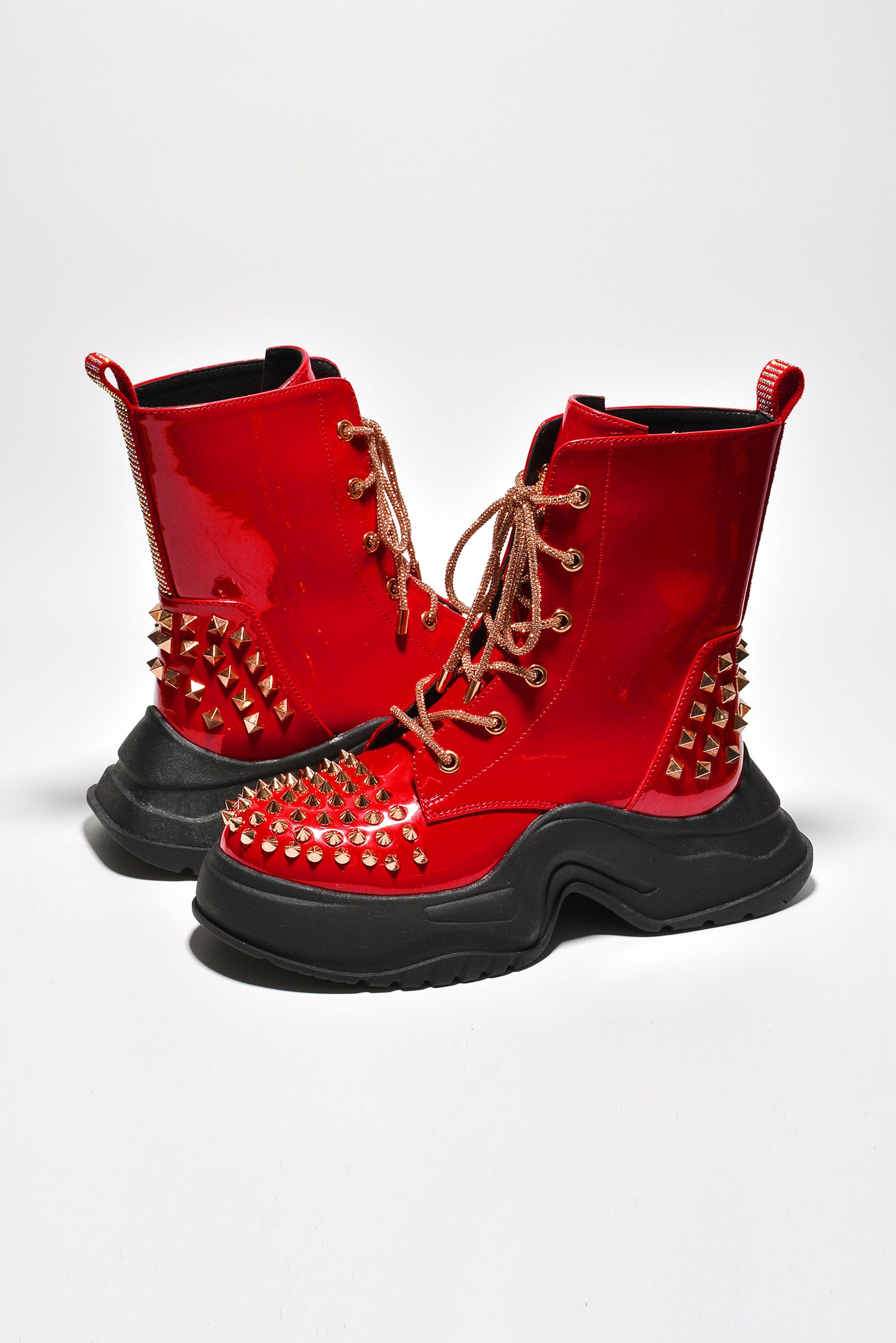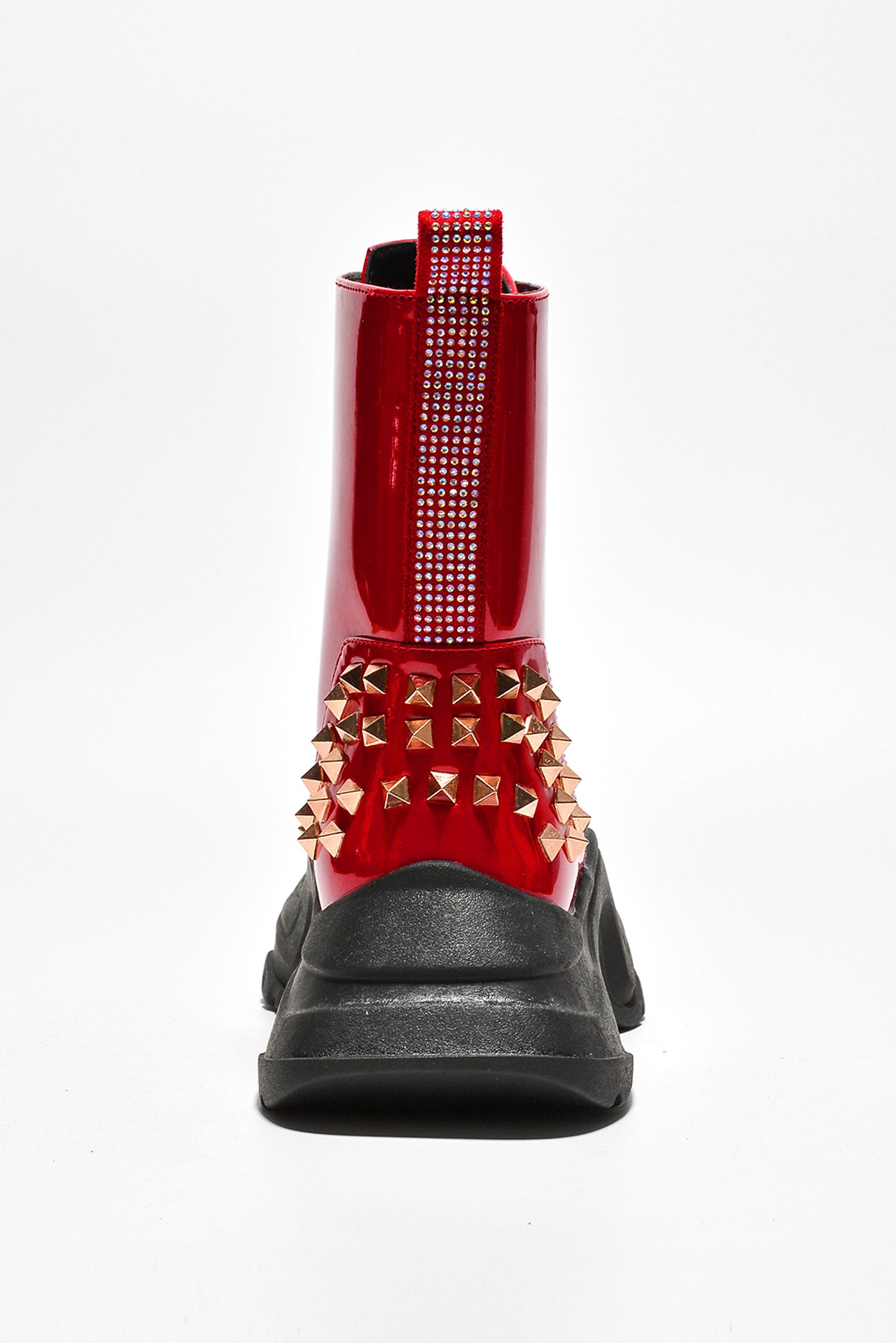 Jadey Spike Studs Rhinestone Chunky Lug Boots - Red