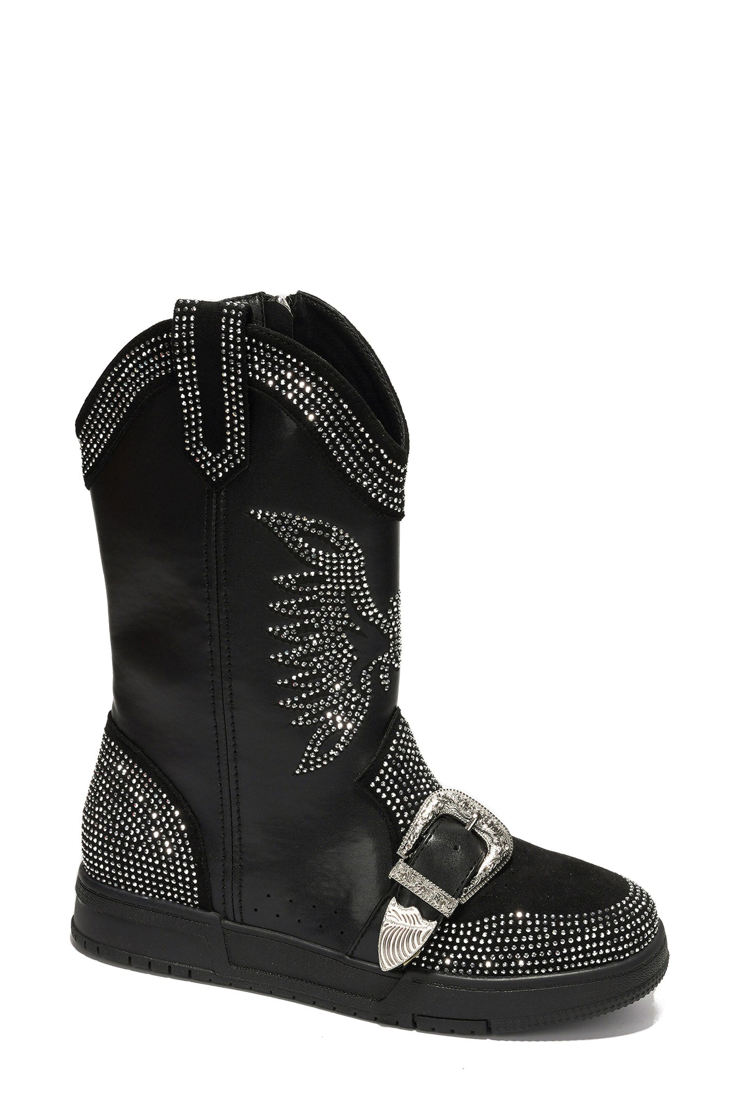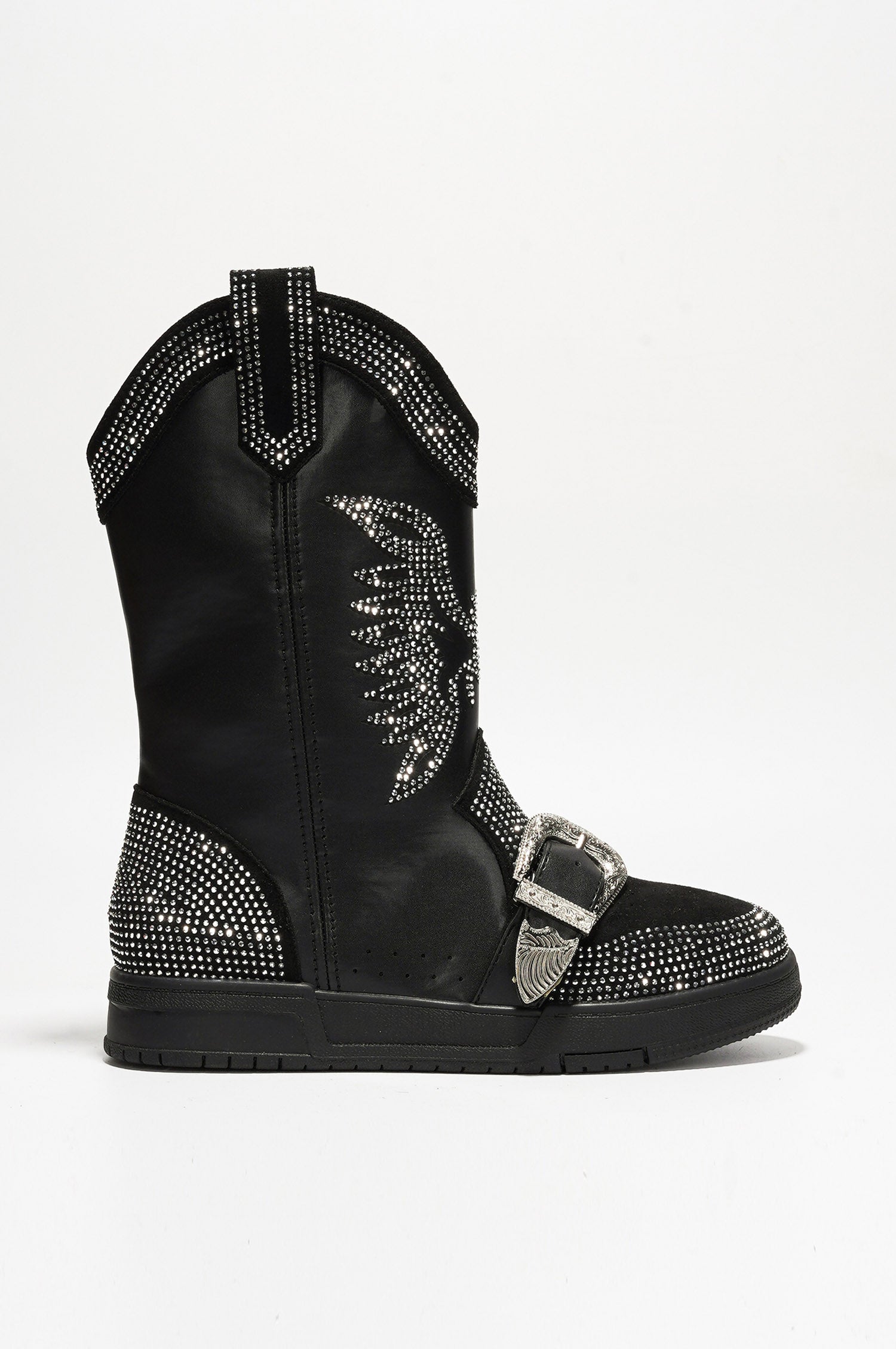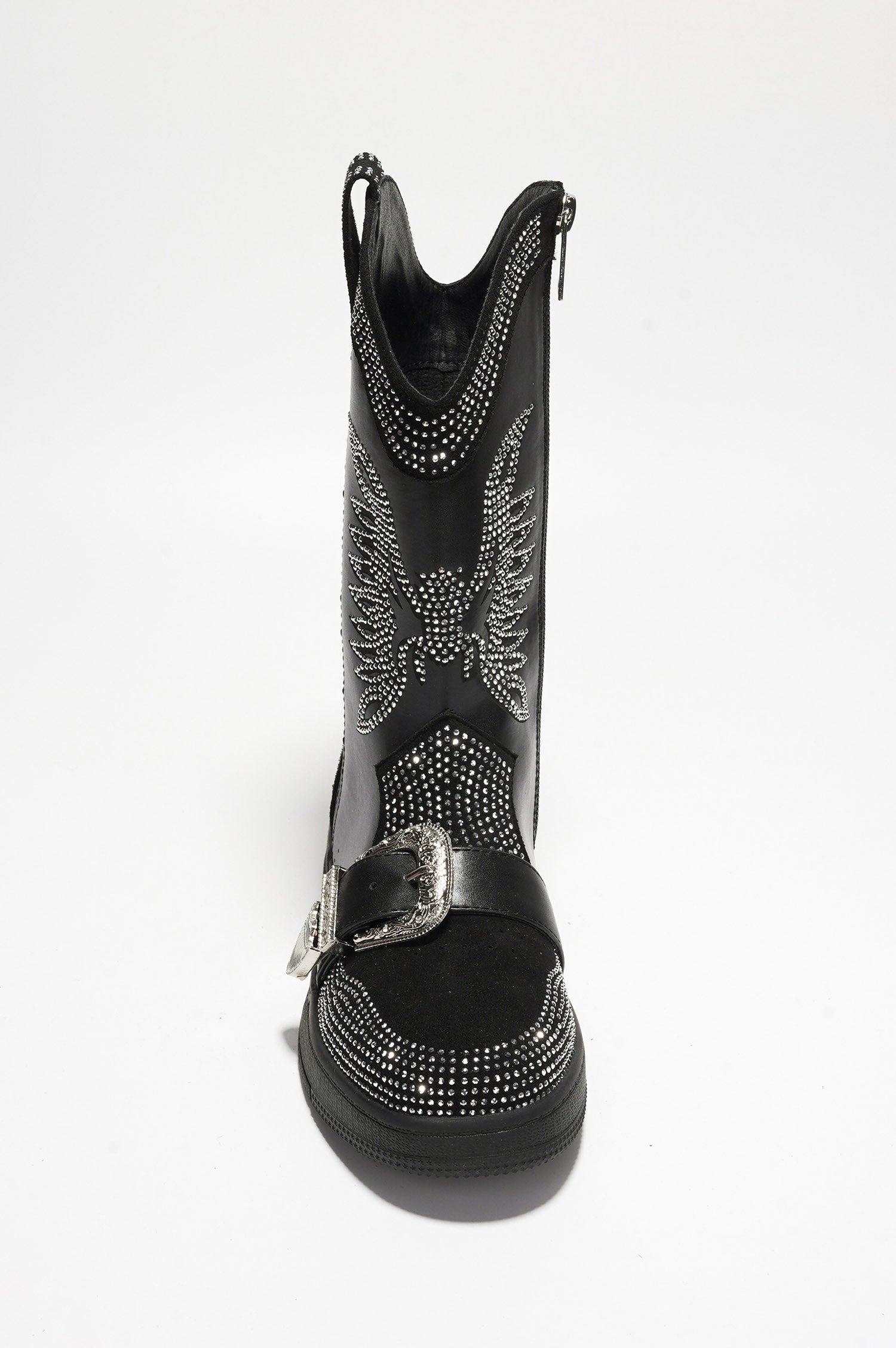 Jonie Western Rhinestone Wing Ankle Boots with Buckle Trim - Black