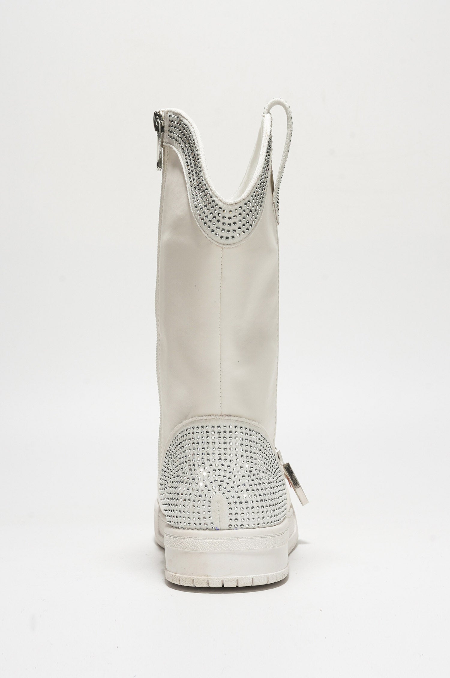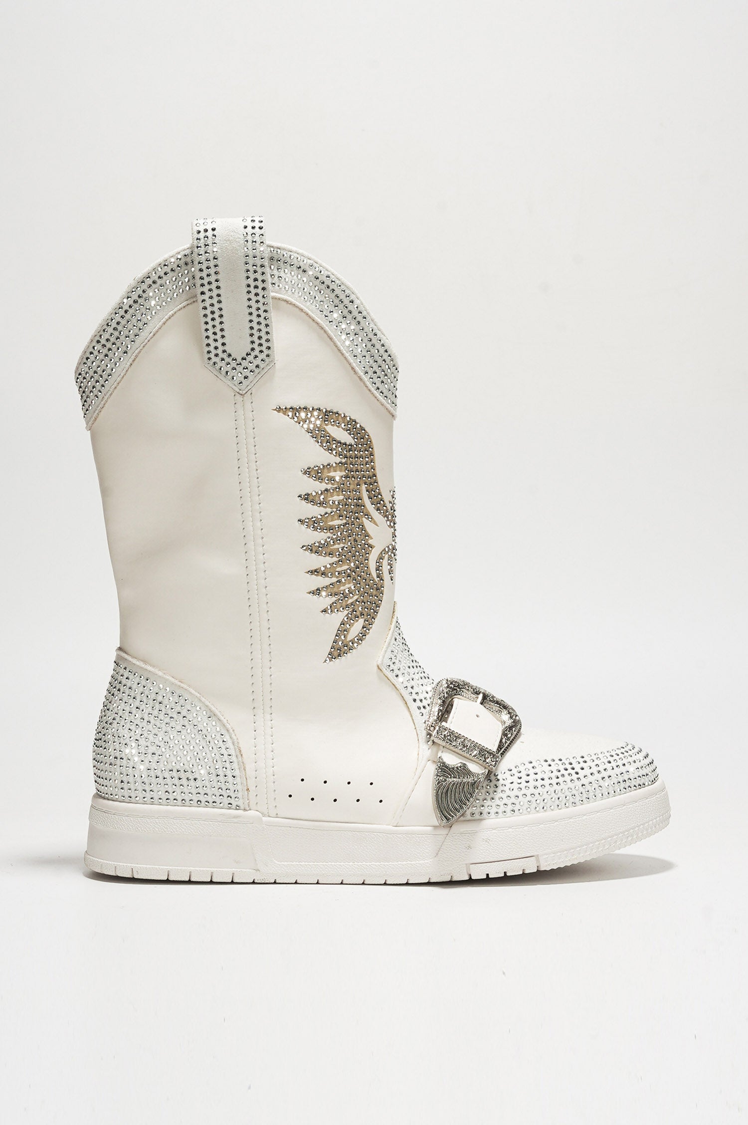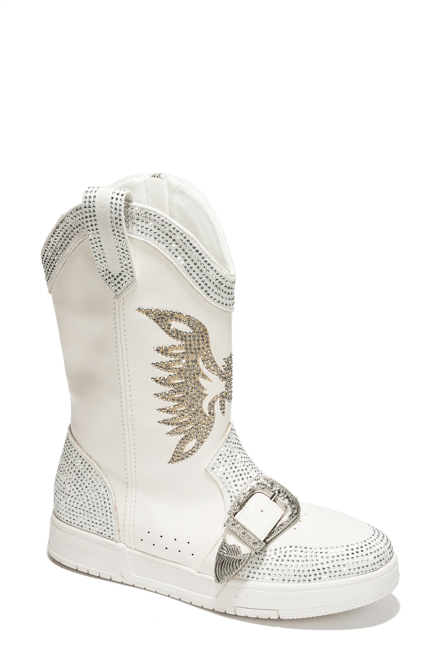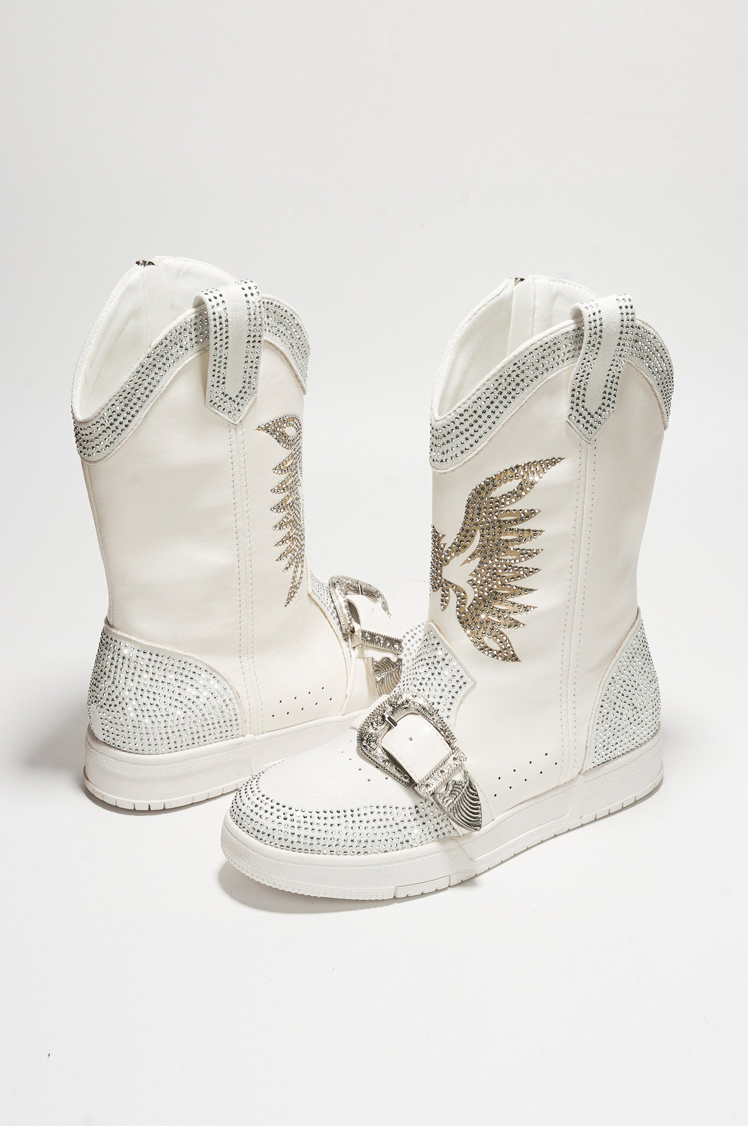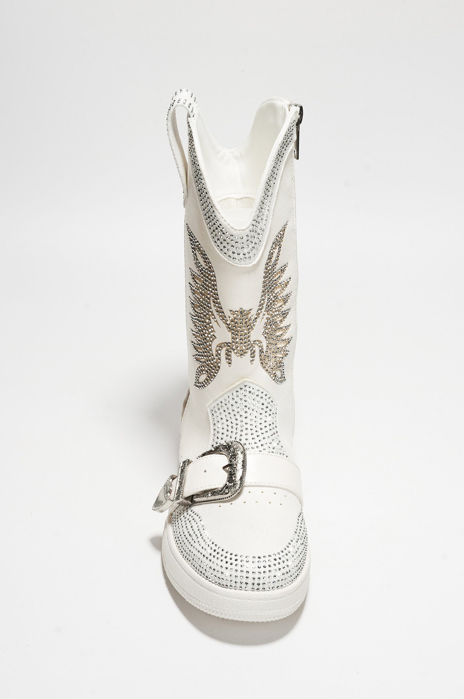 Elevate your footwear game with Cape Robbin's 'JONIE' white booties, where fashion meets flair. These dazzling booties feature intricate rhinestone embellishments and a bold eagle design, embodying fearless style and undeniable glamour. With a sleek side zipper for easy wear and a modern buckle accent, these boots perfectly blend edgy attitude with chic sophistication. Perfect for the trendsetter, the 'JONIE' booties add a touch of dazzle to any outfit. Step out in confidence and make every entrance memorable.