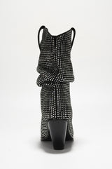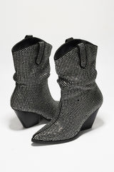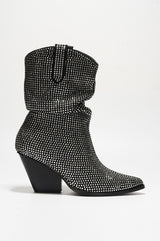 Dazzle in the details with Karry Rhinestone Pointed Western Ankle Boots. Adorned with countless shimmering rhinestones, these boots capture and reflect light from every angle, ensuring you stand out. The slouched style adds a modern twist to the classic ankle boot design, while the pointed toe and chunky heel enhance the sophisticated look. Whether youre aiming for a subtle daytime shine or a glamorous night-time glow, these boots will carry you through with elegance and flair.