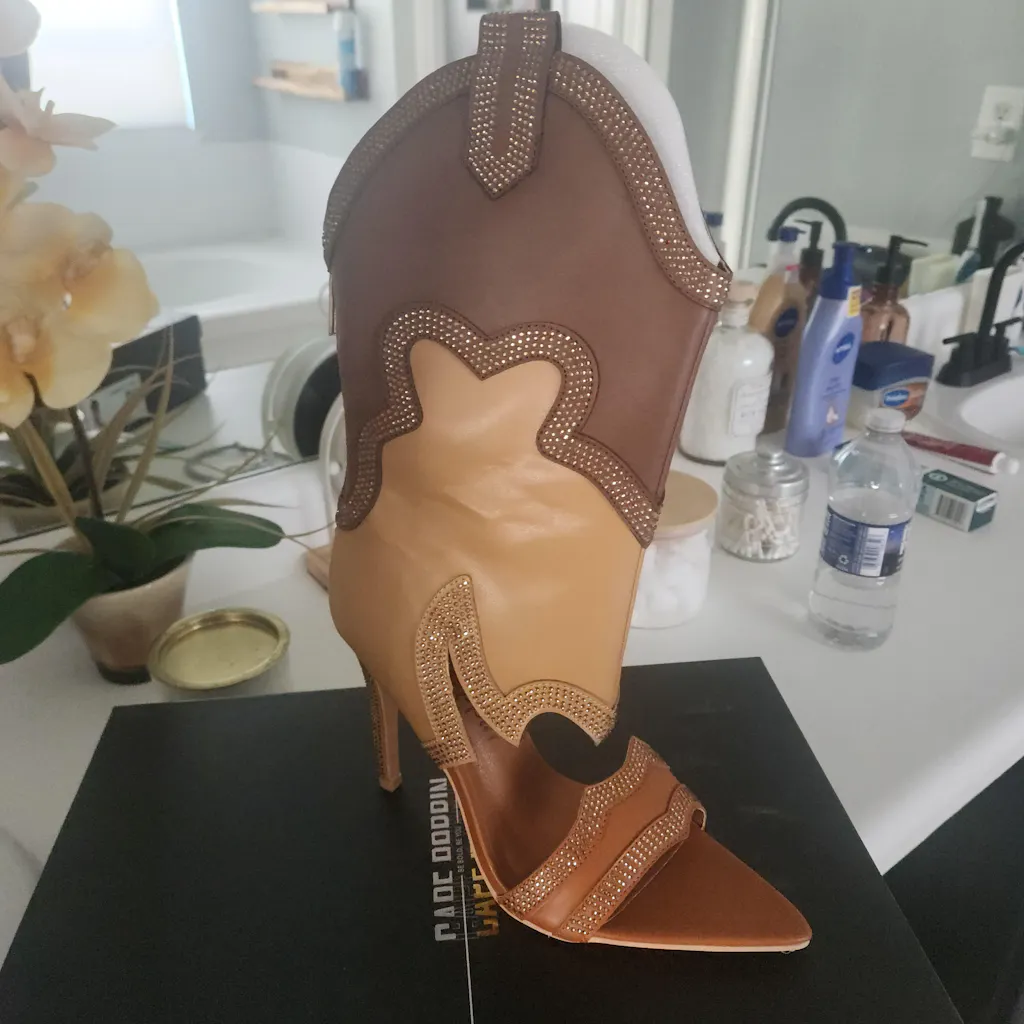 Step into show-stopping style with Cape Robbins Nayaye. These bold heels fuse Western edge with glamorous sparkle, featuring eye-catching cutouts and dazzling rhinestones. Perfect for nights out or statement looks, Nayaye brings confidence, attitude, and undeniable allure to every step.