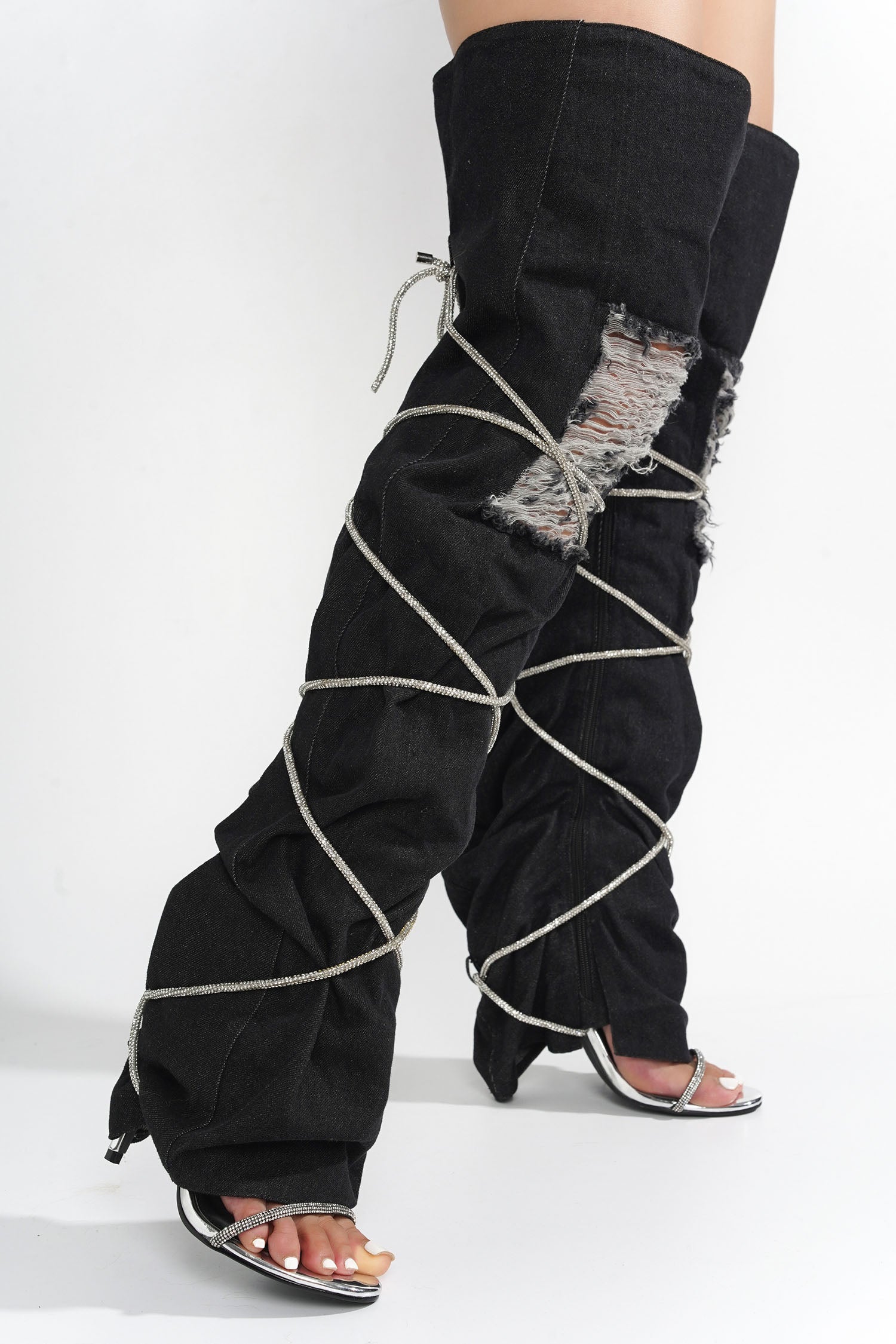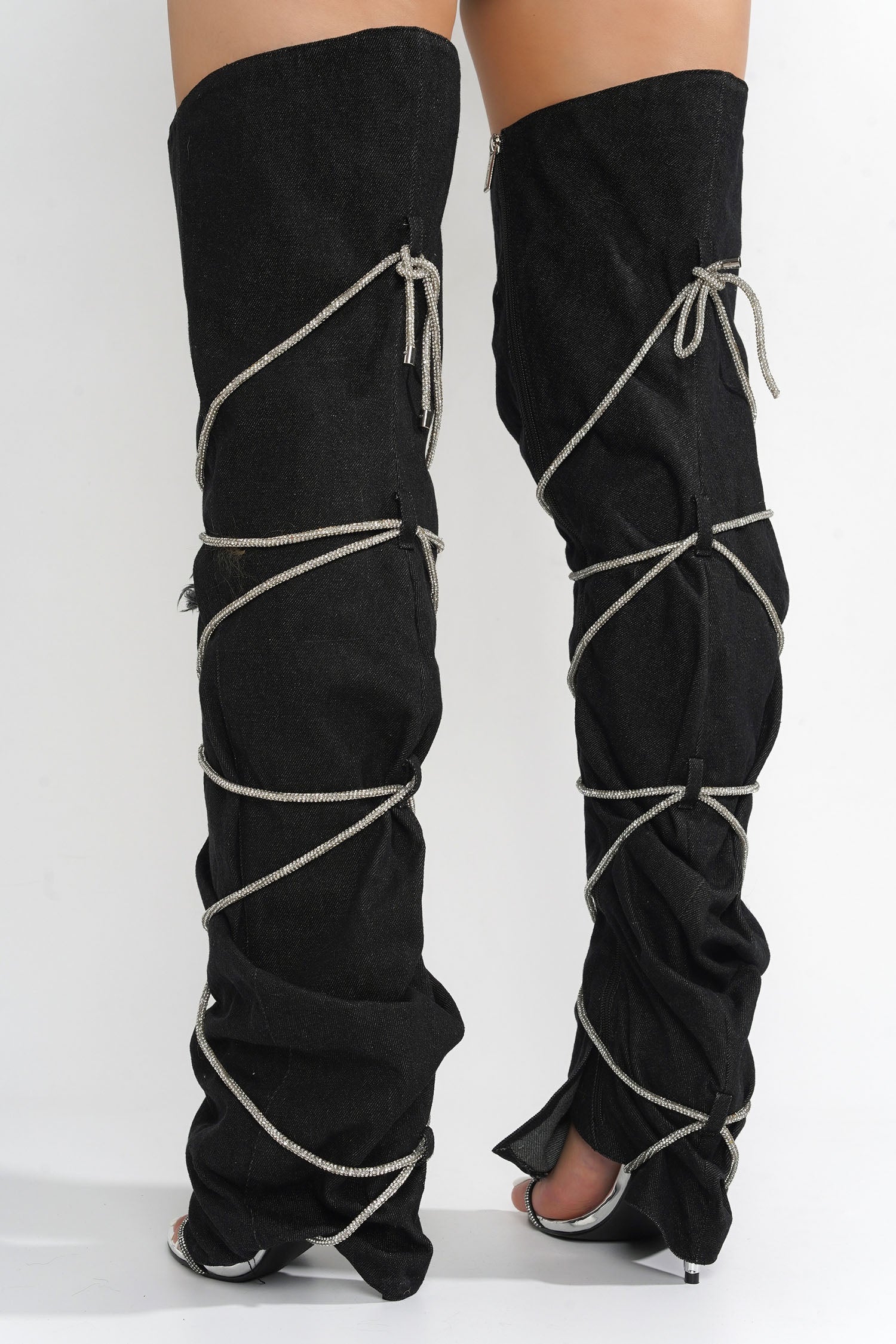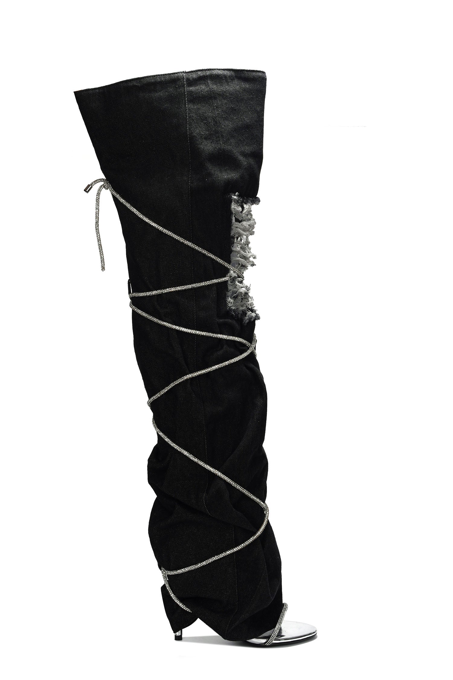 Nobu Rhinestone Thigh-High Denim Booties - Black