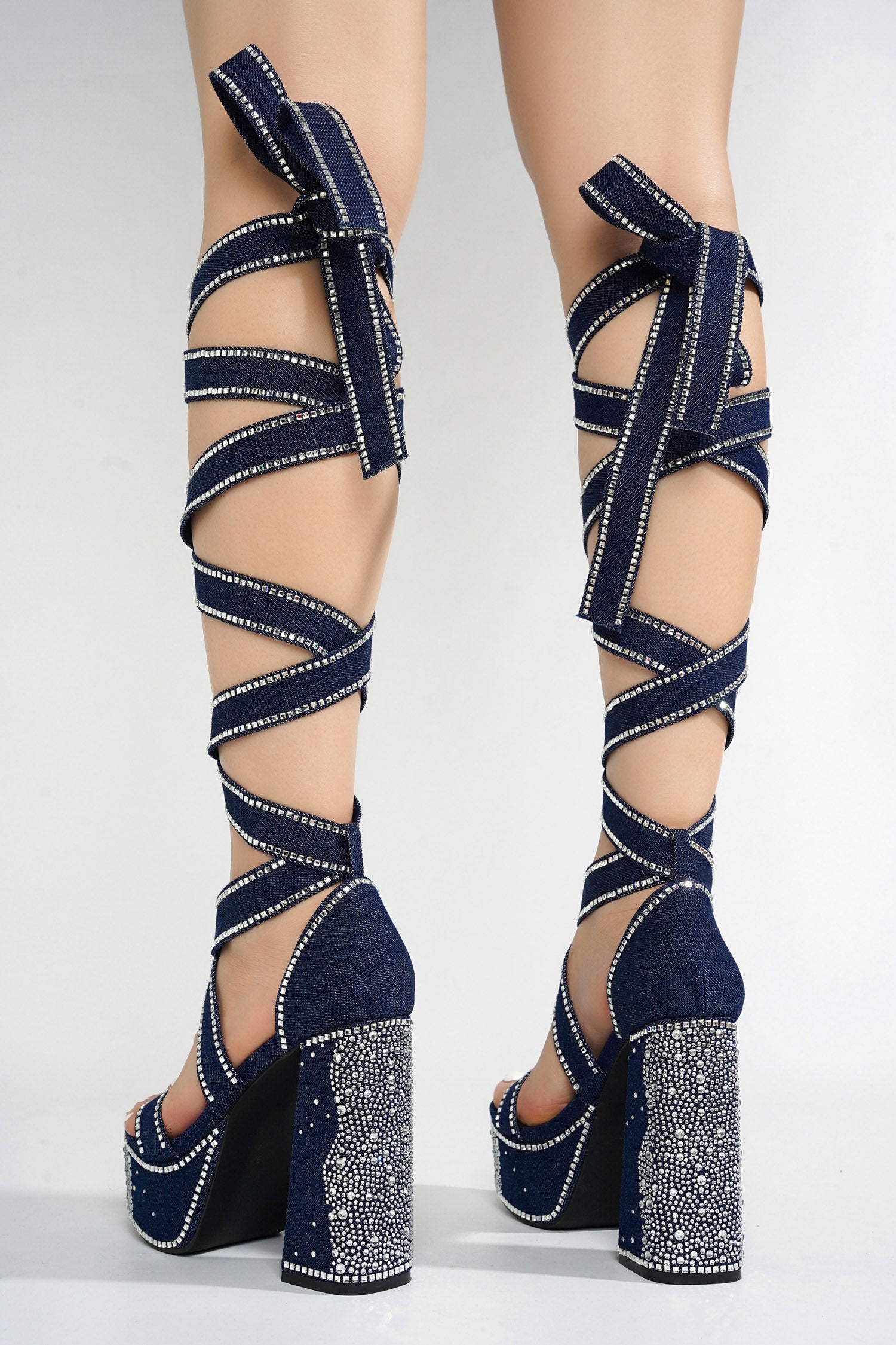Rozalie Rhinestone Lace Up Chunky Block Platform Heels - Denim