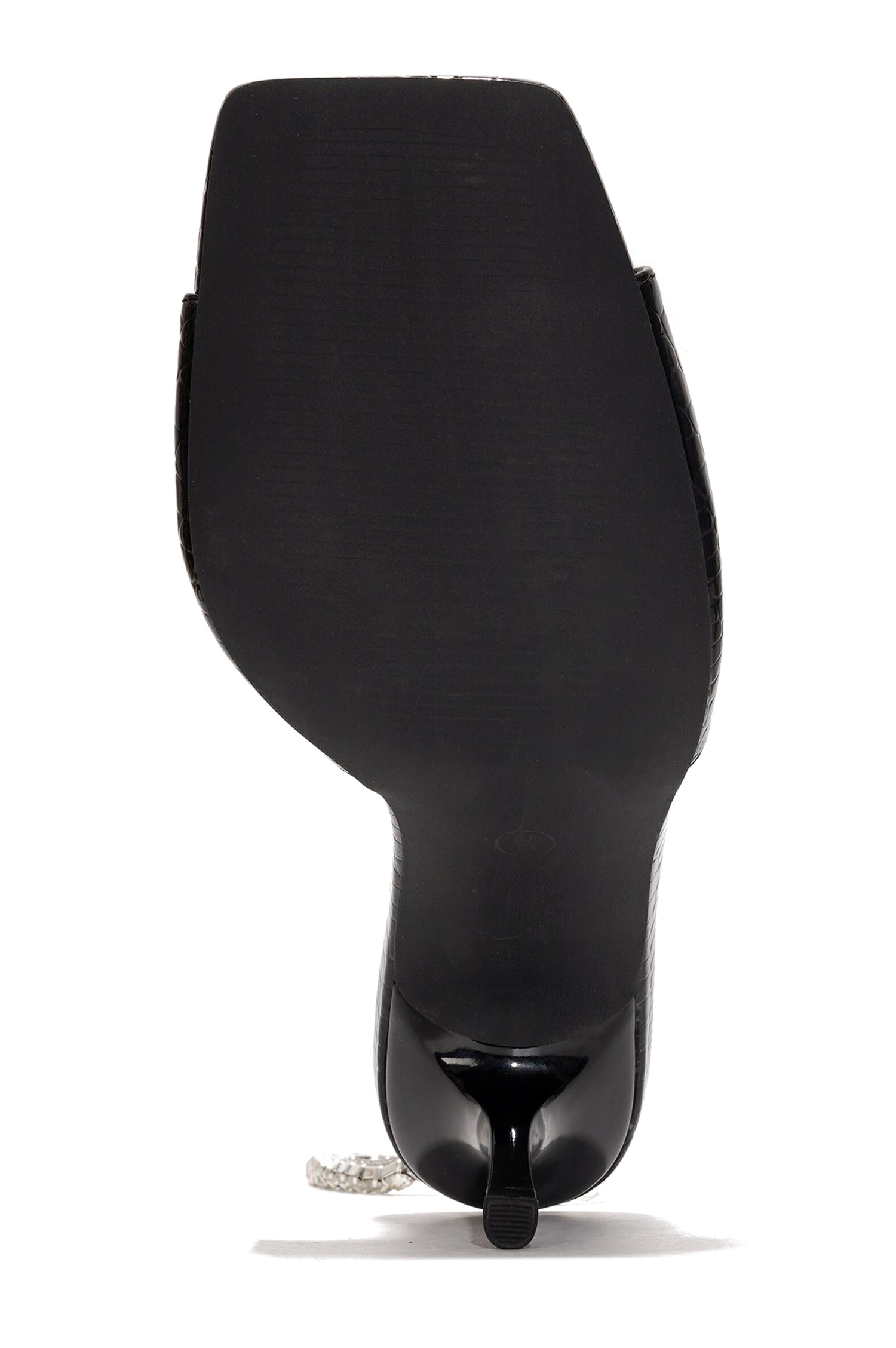 Introducing the Cape Robbin Tiffie heels, where exotic texture meets exquisite sparkle. Designed for the woman who demands both distinction and dazzle, these sandals blend the powerful allure of crocodile-embossed leather with the breathtaking brilliance of a rhinestone chain. This is footwear that doesn’t just complement an outfit—it defines it.