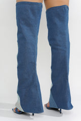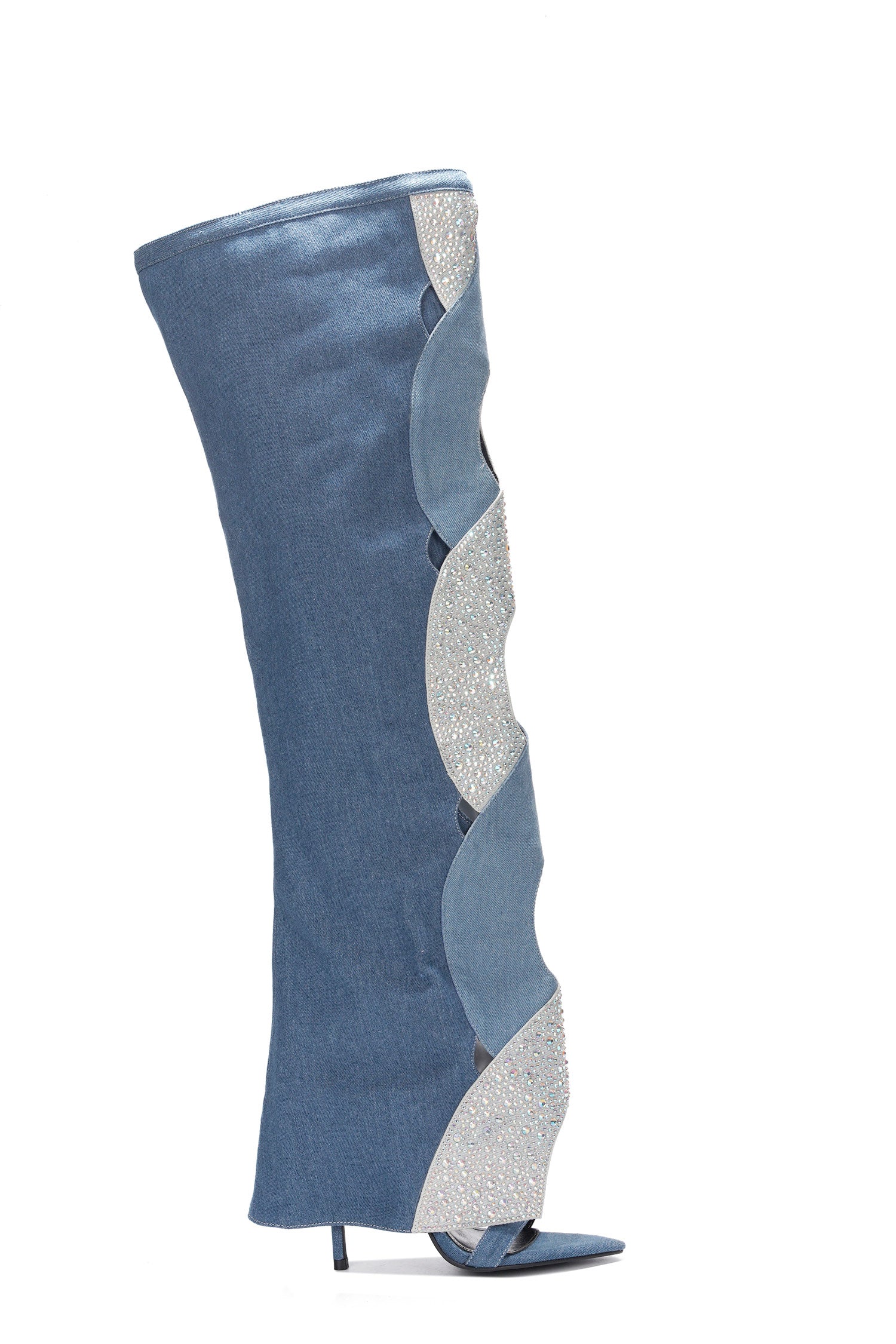 Totoga Rhinestone Thigh High Fold Over Boots - Denim