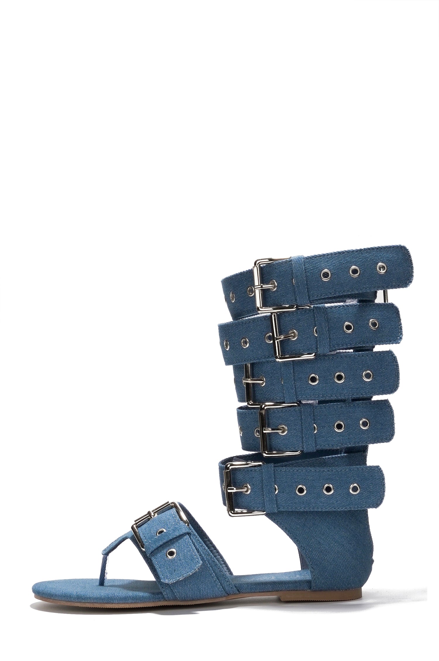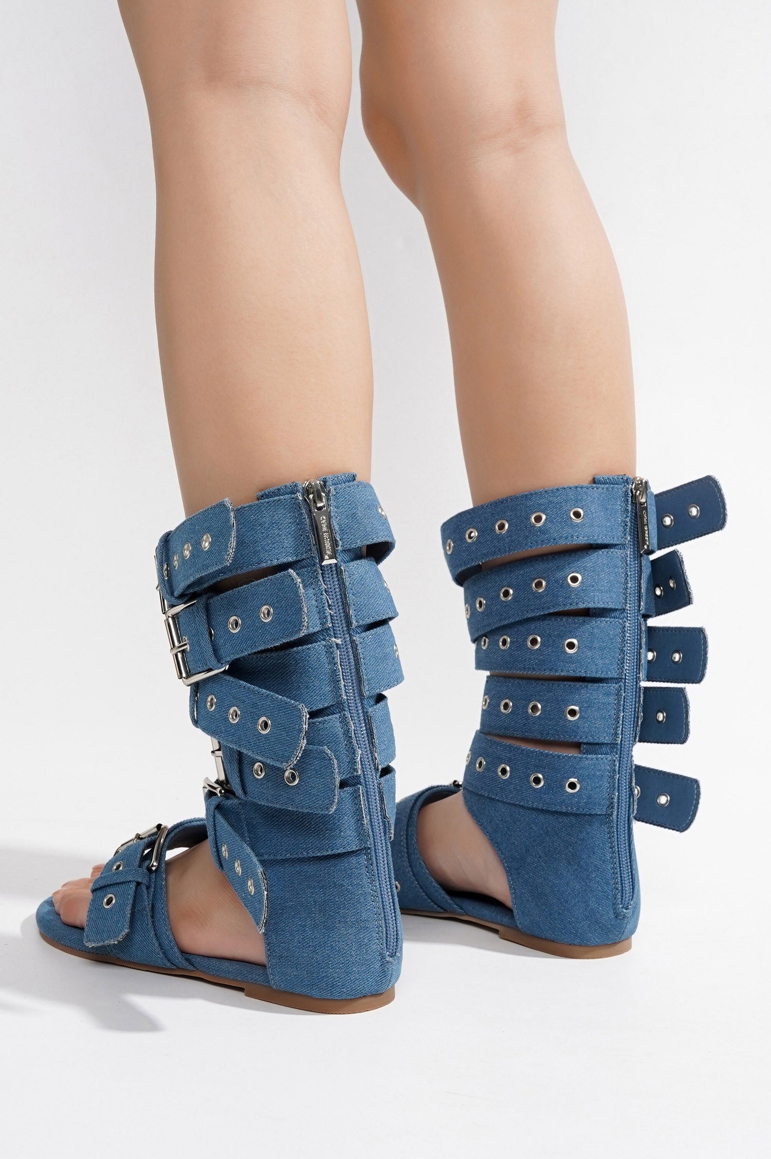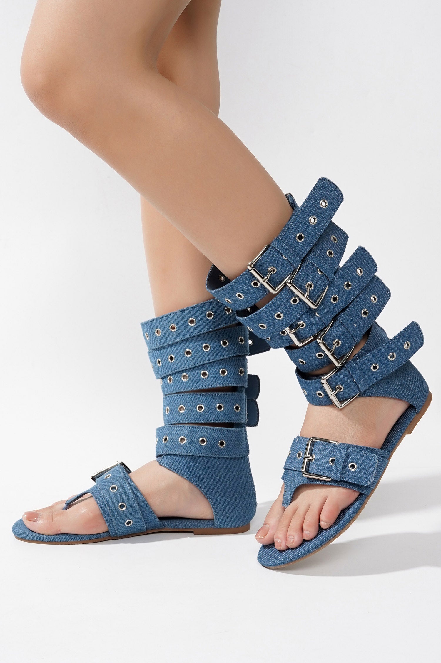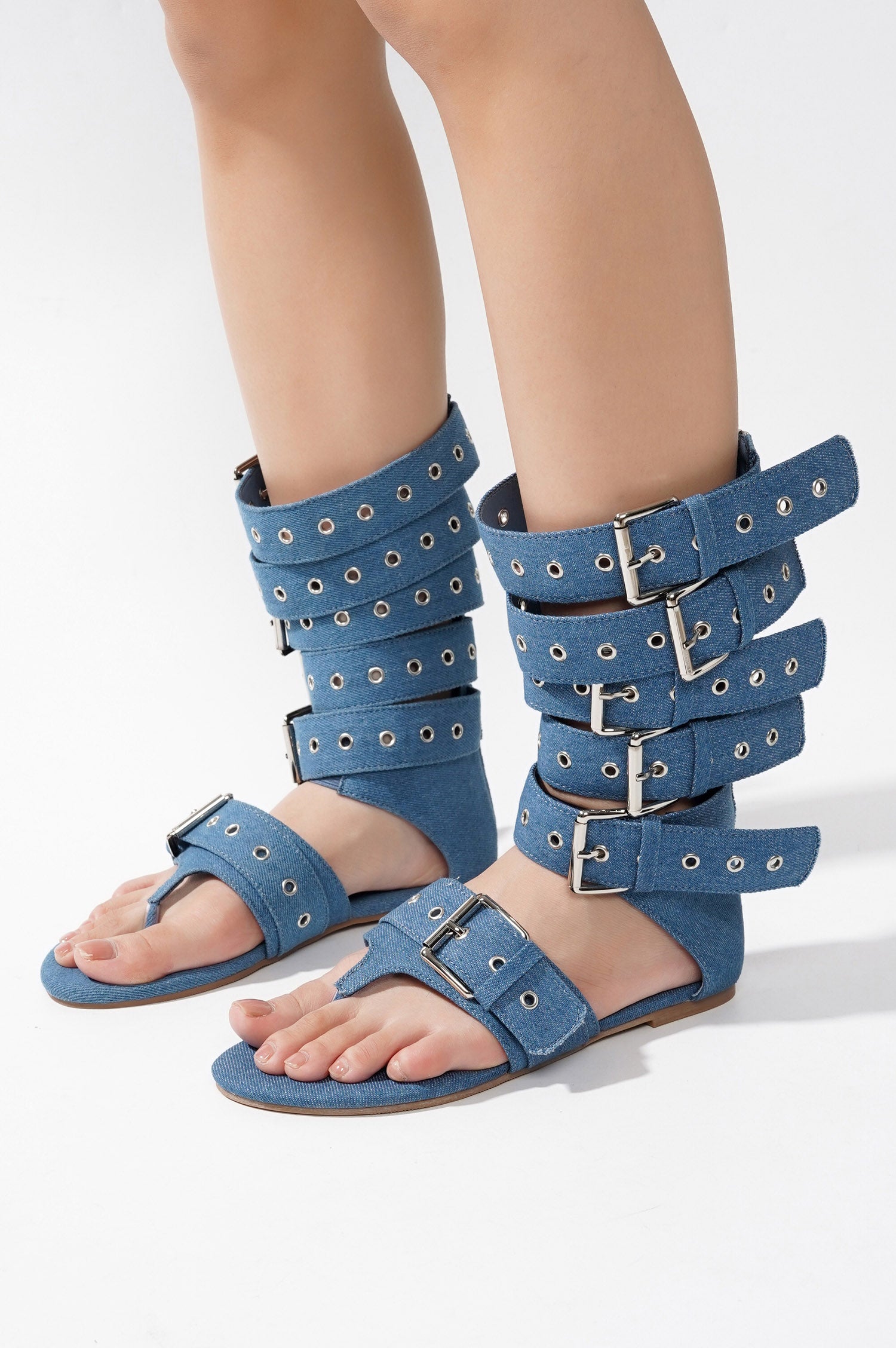 Discover contemporary style with the Viki Denim Belt Buckled Flat Sandals. Featuring a trendy denim finish and a multi-buckle design, these sandals offer a fashionable edge and secure fit. Enjoy the blend of fashion-forward design and comfort, perfect for casual outings, brunches or relaxed strolls.
