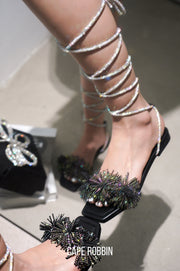 These Willson sandals are the perfect mix of sexy and elegant. With a strappy lace-up silhouette, rhinestone rope and fringe trim for a touch of sparkle, and three color options to choose from black, nude, and rainbow these sandals are sure to make any outfit feel special.