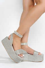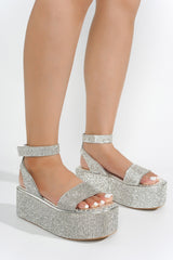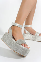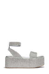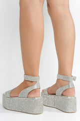Yolande Rhinestone Glitter Ankle Strap Flatform Sandals - Silver